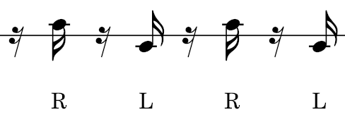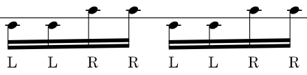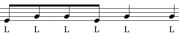 In order to tell what hand to use to hit a certain gong, I adapt the concept of, "sticking," that I learned from my western percussion background, where under each note appears to be an, "R," or an, "L,"